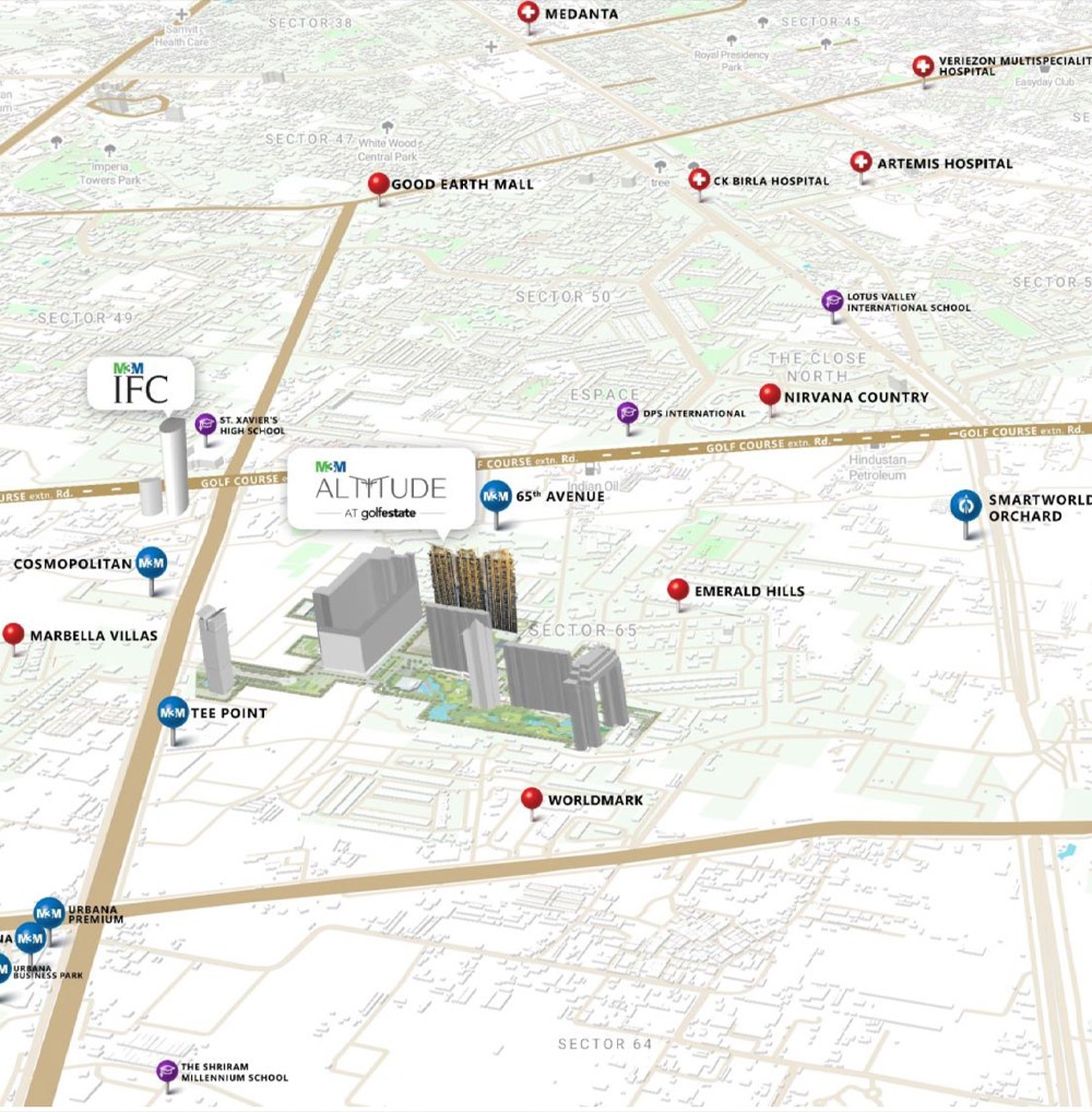 The residential experience is enhanced by a central green area surrounded by lovely parks and a 9-hole golf course. Numerous amenities and services are available to residents, including a sophisticated clubhouse with salons, spas, game rooms, and gyms. With the vibrant backdrop of Gurugram, M3M Altitude Sector 65 provides an ideal setting for creating memories.